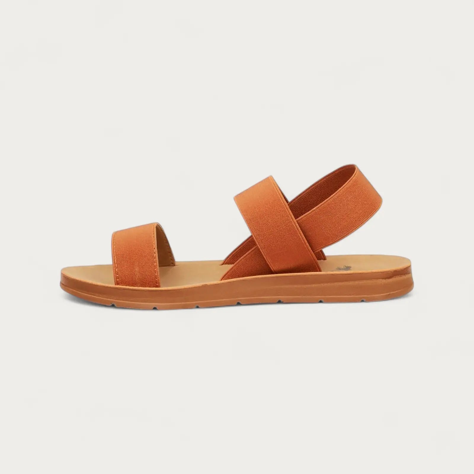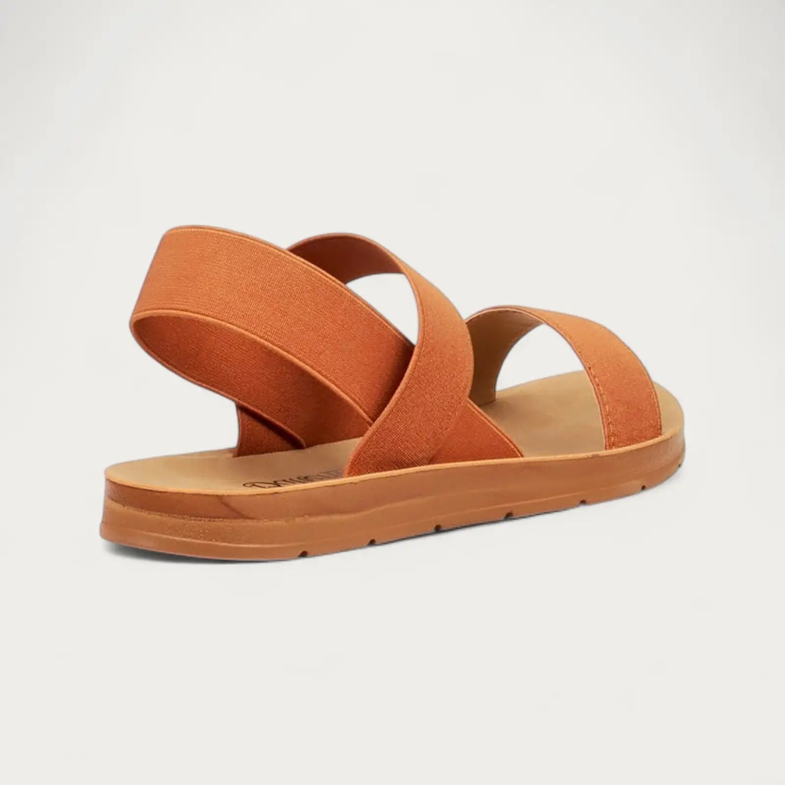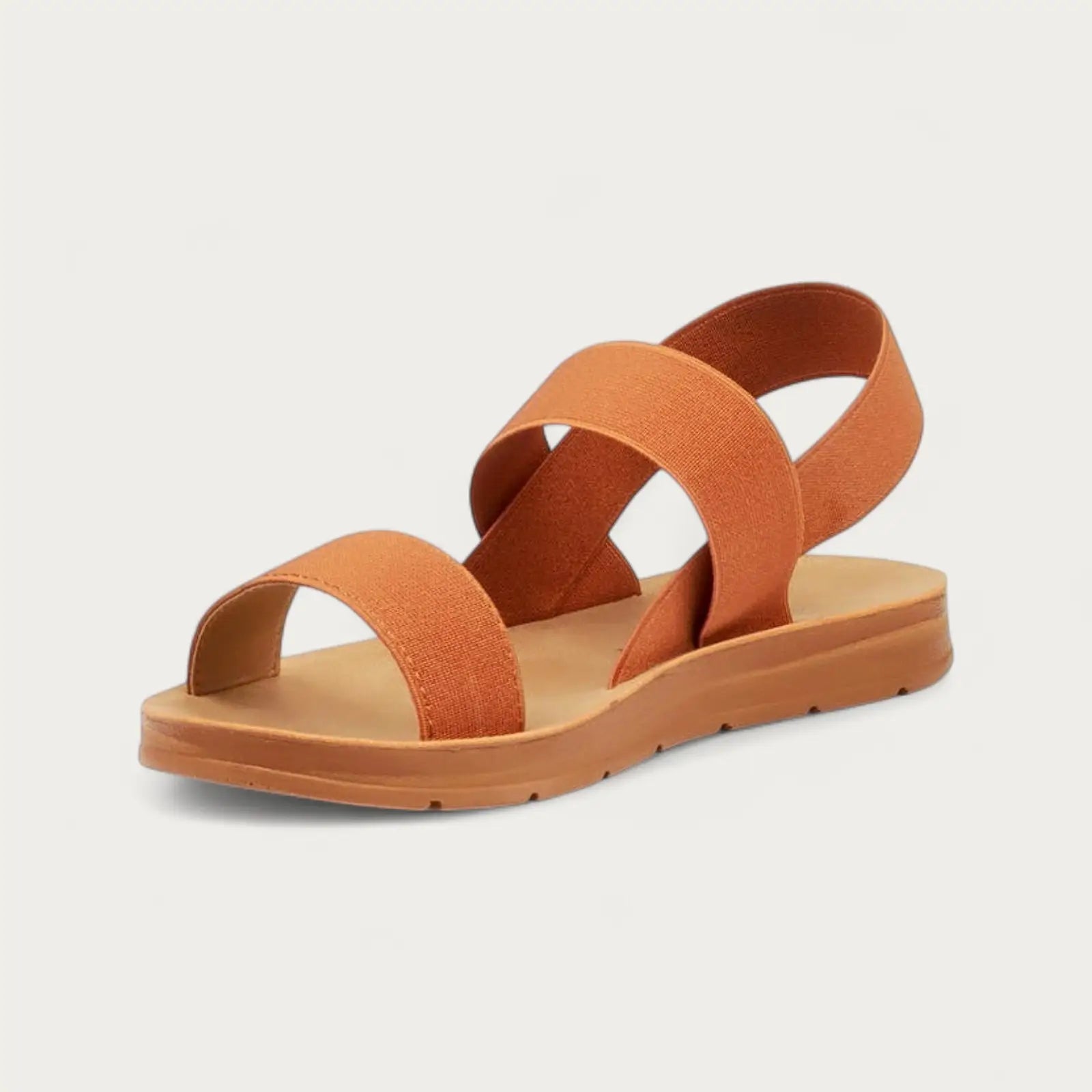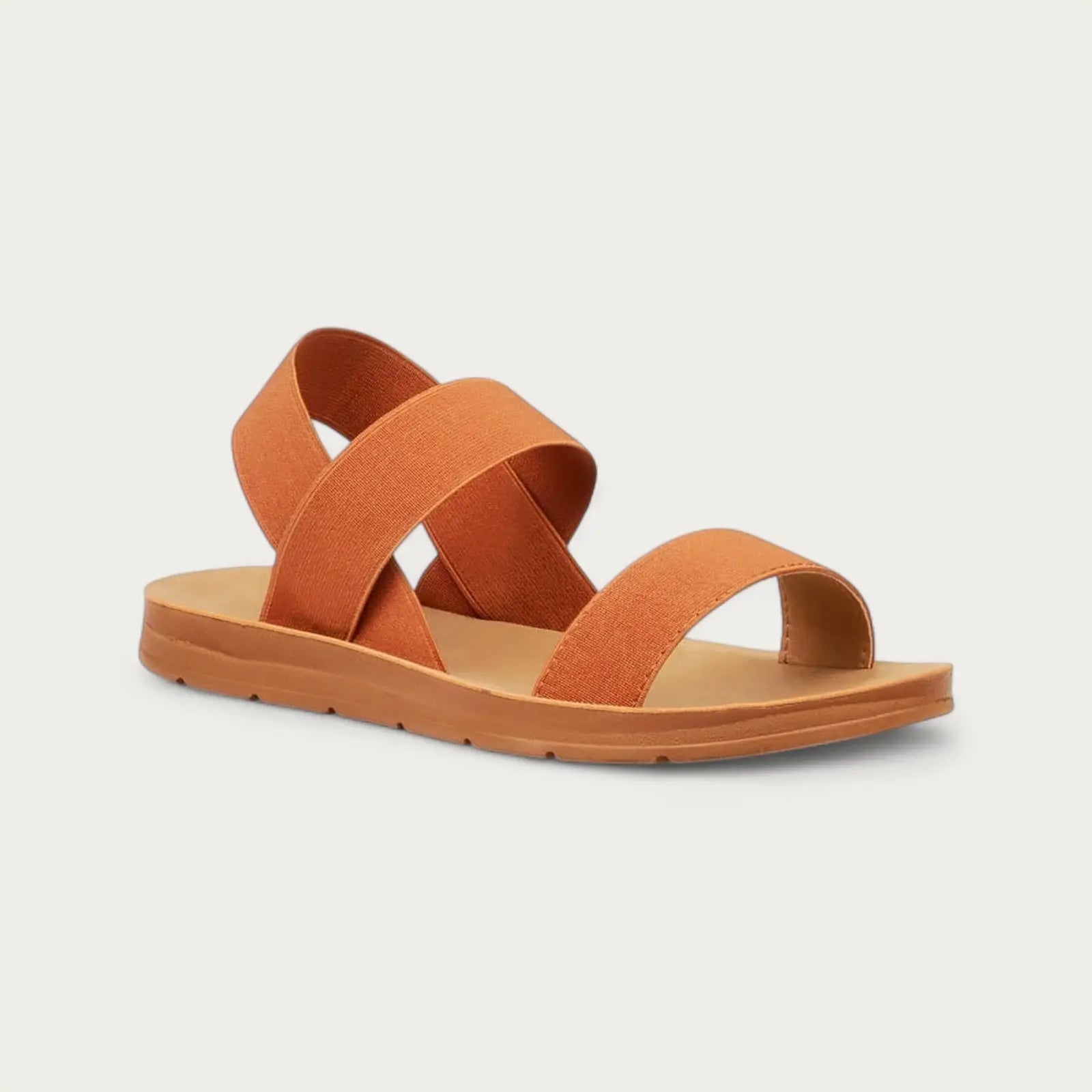 - Tan minimalist sandal with cross-over fabric straps