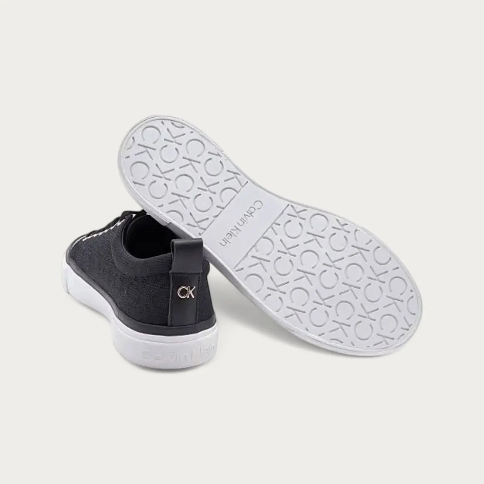 Crafted from premium black textile and faux leather, it features a smooth finish accented with a metallic Calvin Klein logo plate at the lace line. The contrasting white vulcanised sole gives it a fresh, contemporary appeal, while the cushioned footbed ensures all-day comfort without compromising on style.