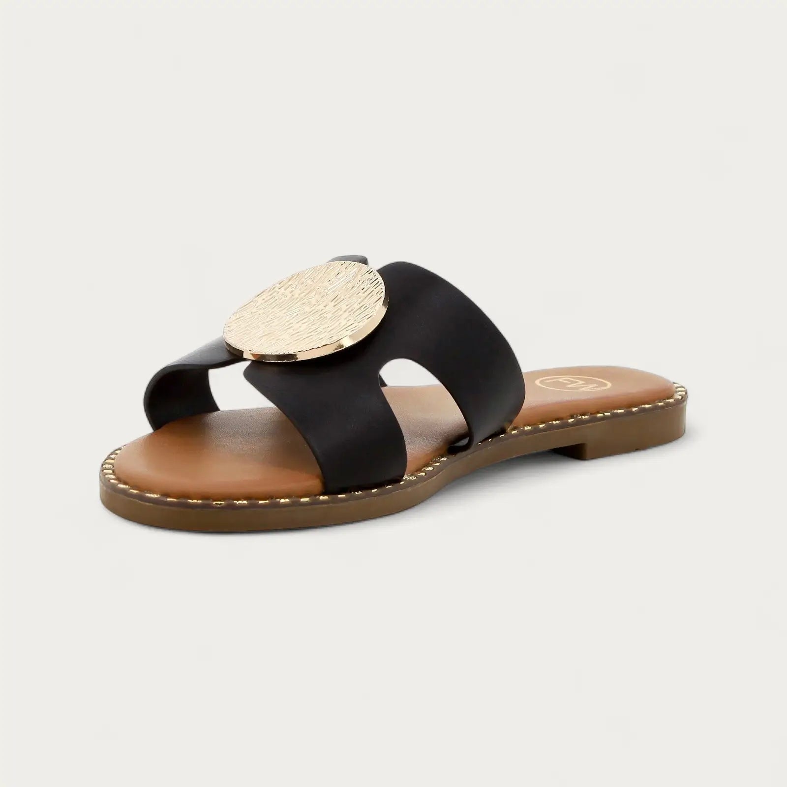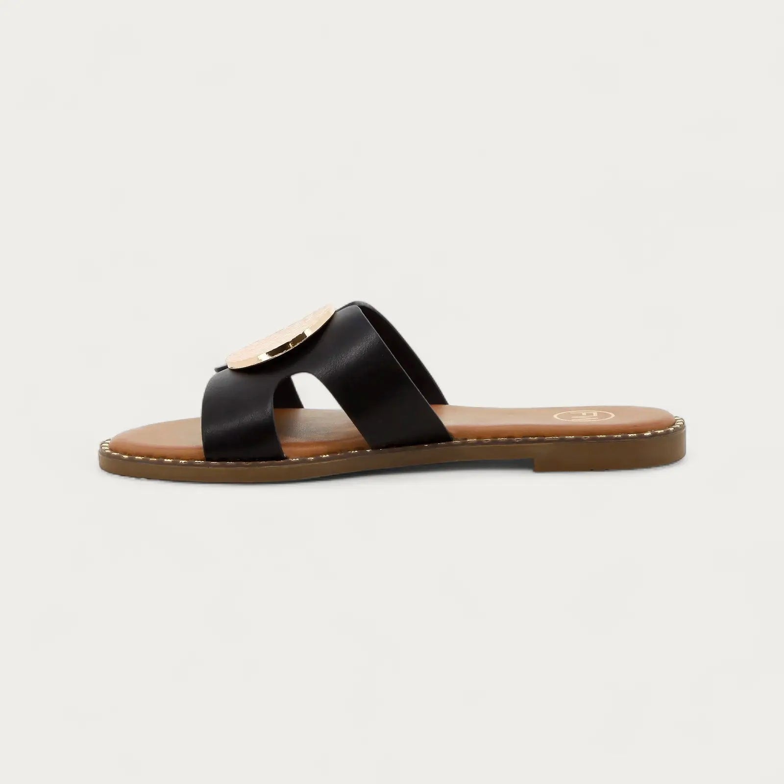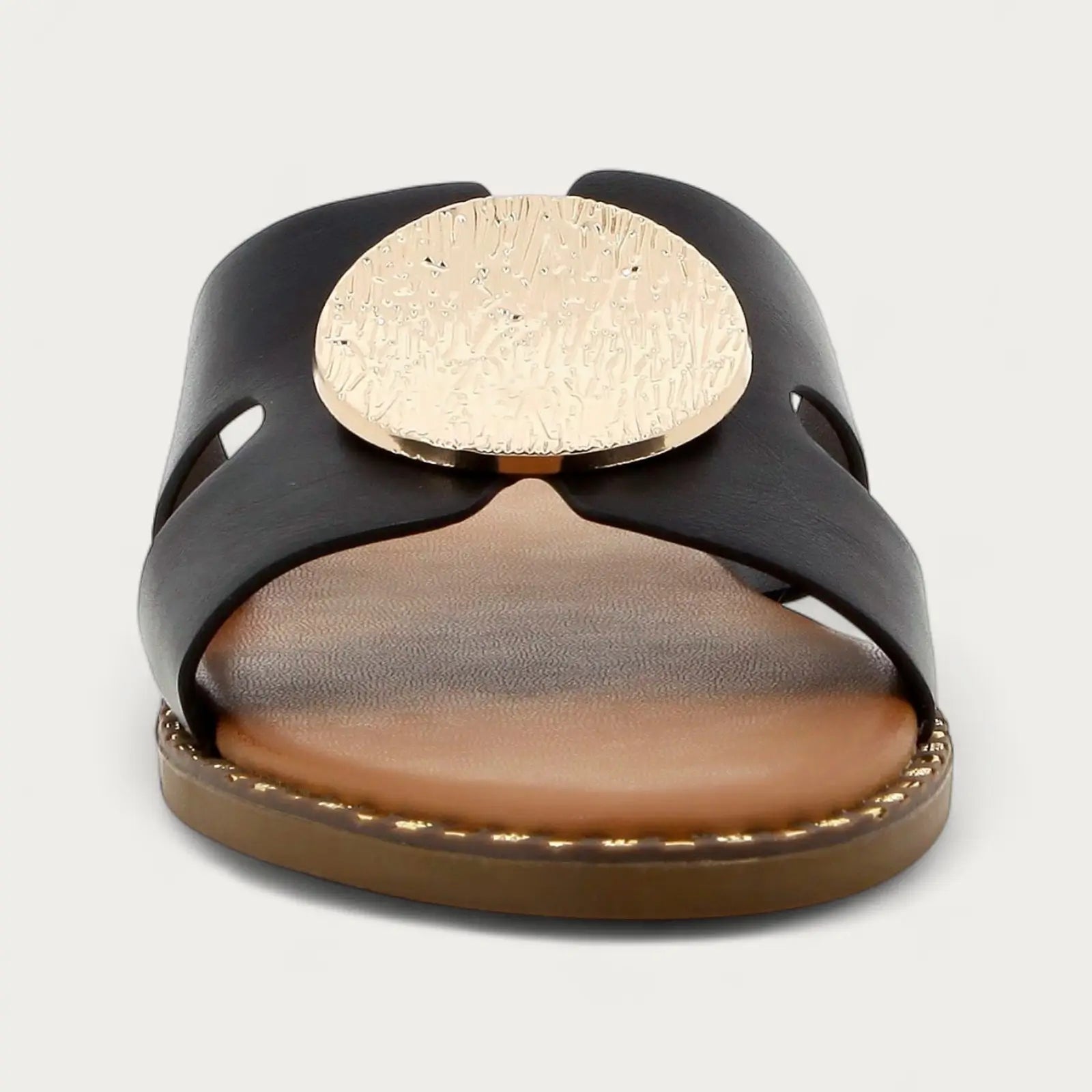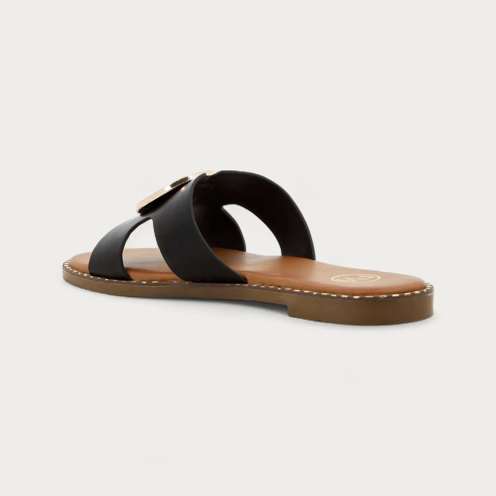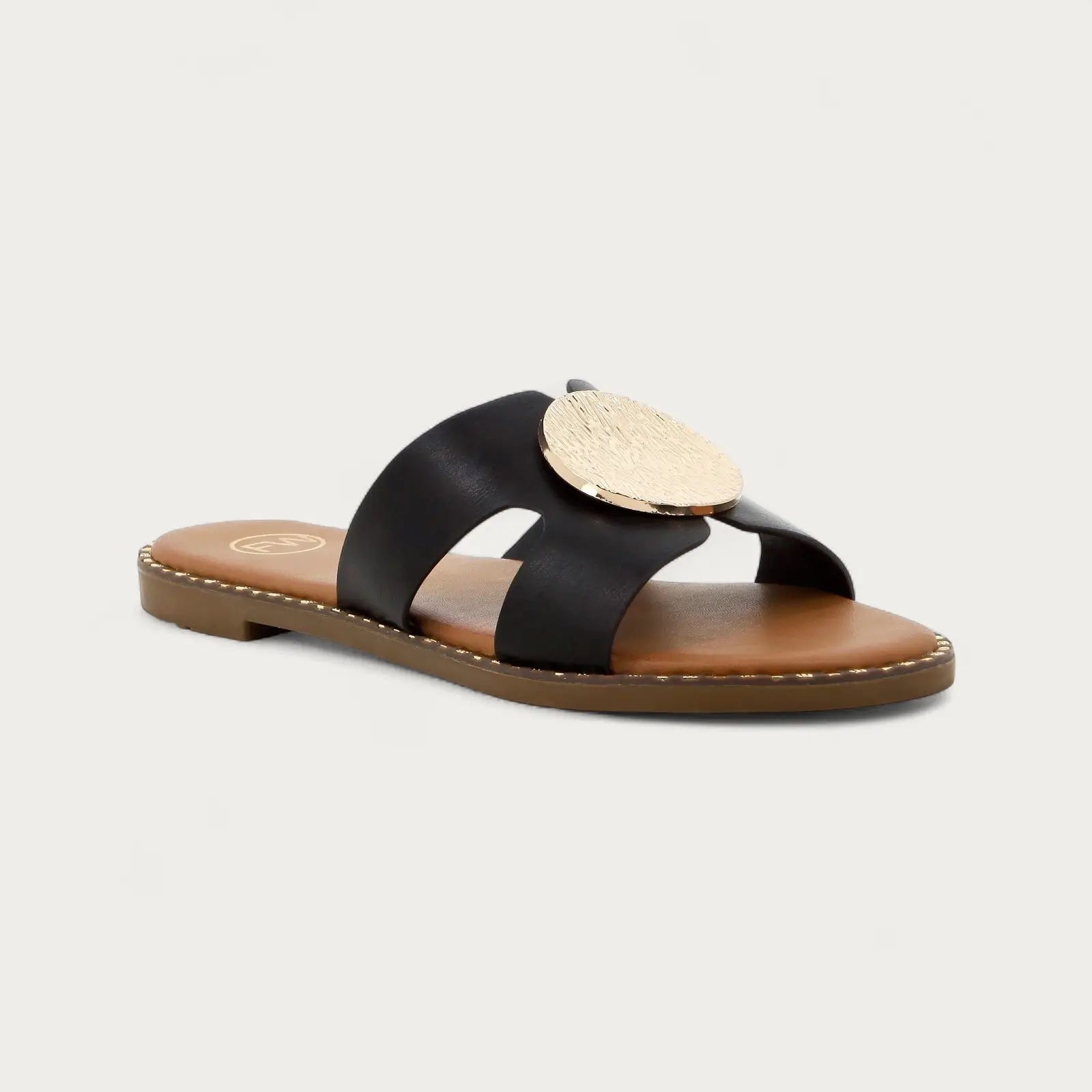 Crafted with a smooth faux-leather upper and cushioned footbed, the Natasha Sandal delivers both comfort and style. Its slip-on silhouette ensures ease of wear, while the gold accent adds just the right touch of luxury — perfect for modern women who love understated glamour.