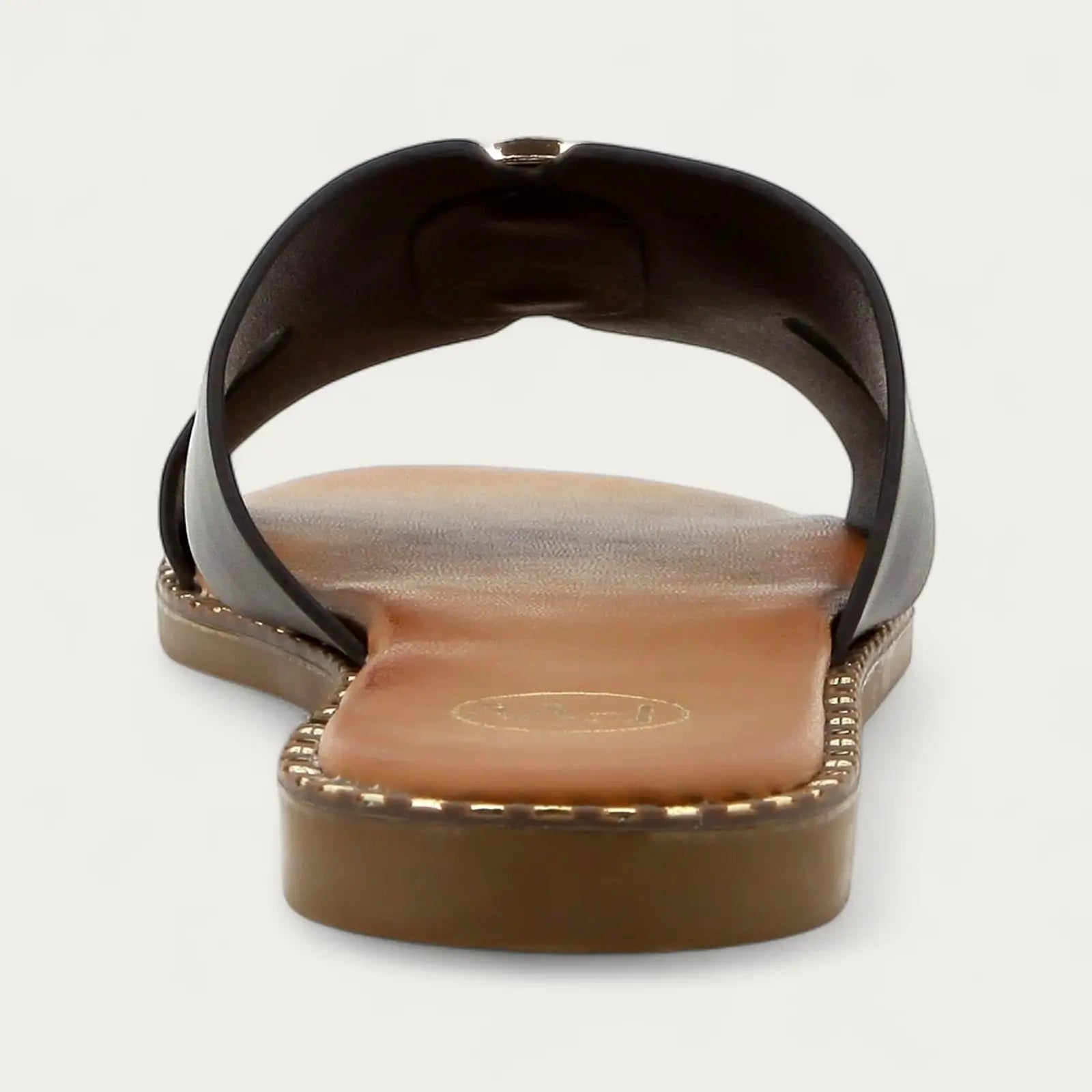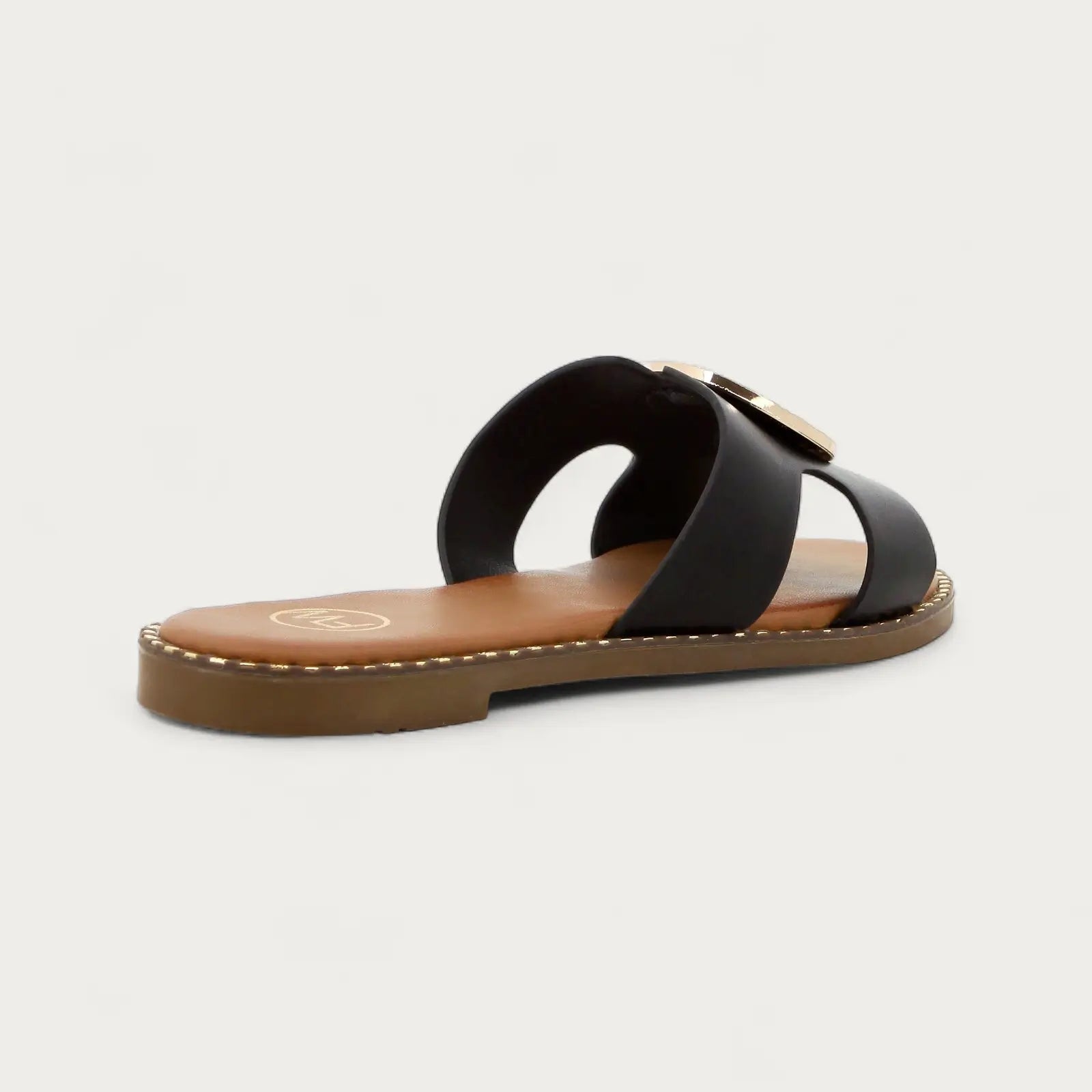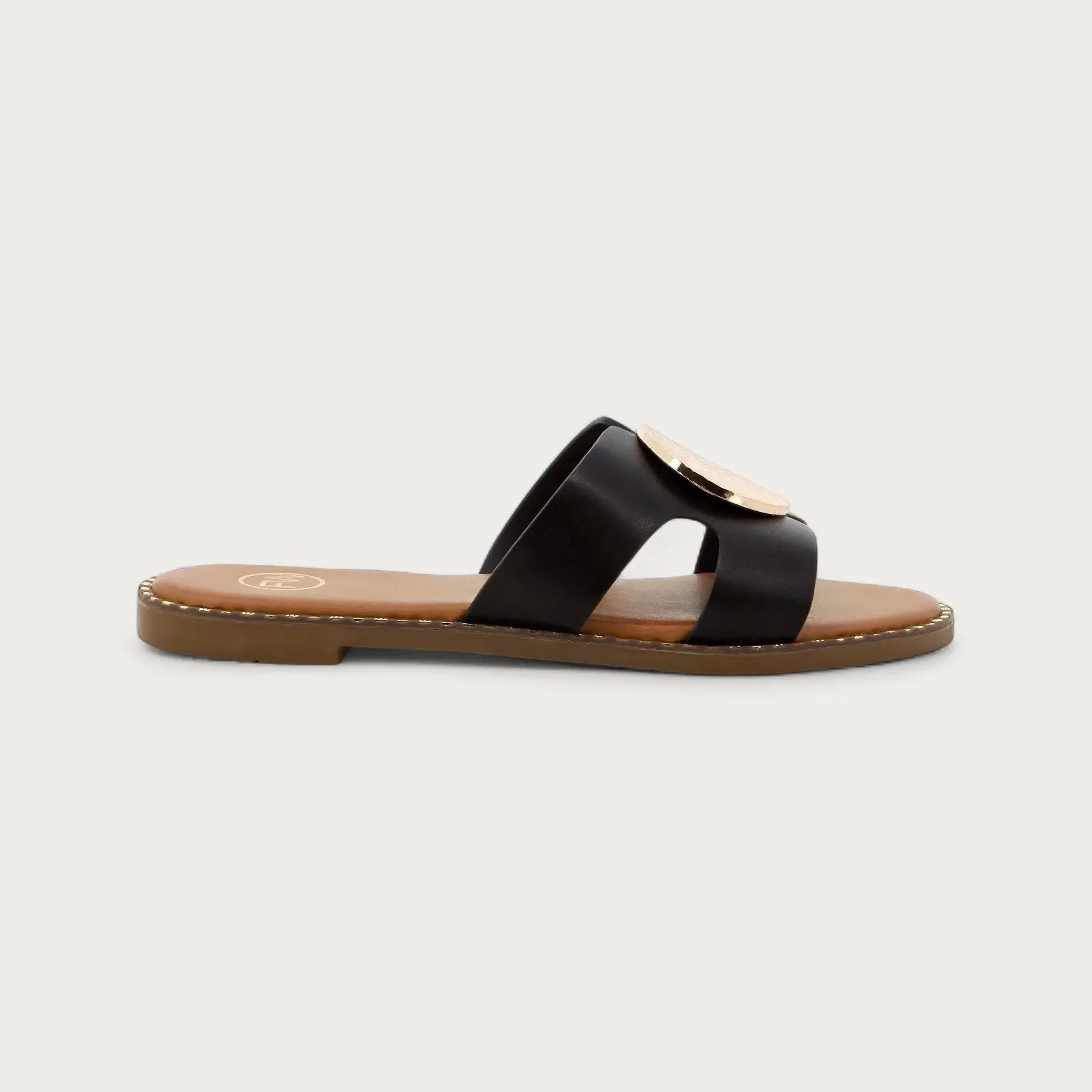 Step into timeless elegance with the Footwork Natasha Black Sandal, where minimal design meets bold detail. This versatile slide pairs classic black sophistication with a statement gold emblem, creating a look that’s effortlessly chic from day to night.