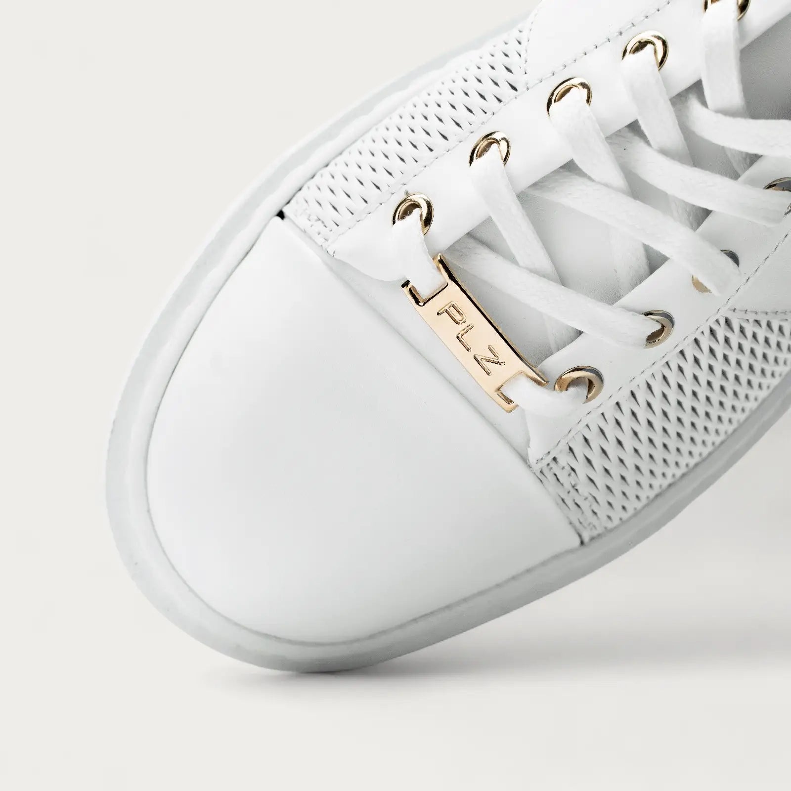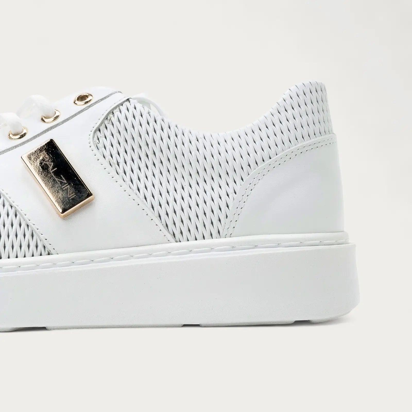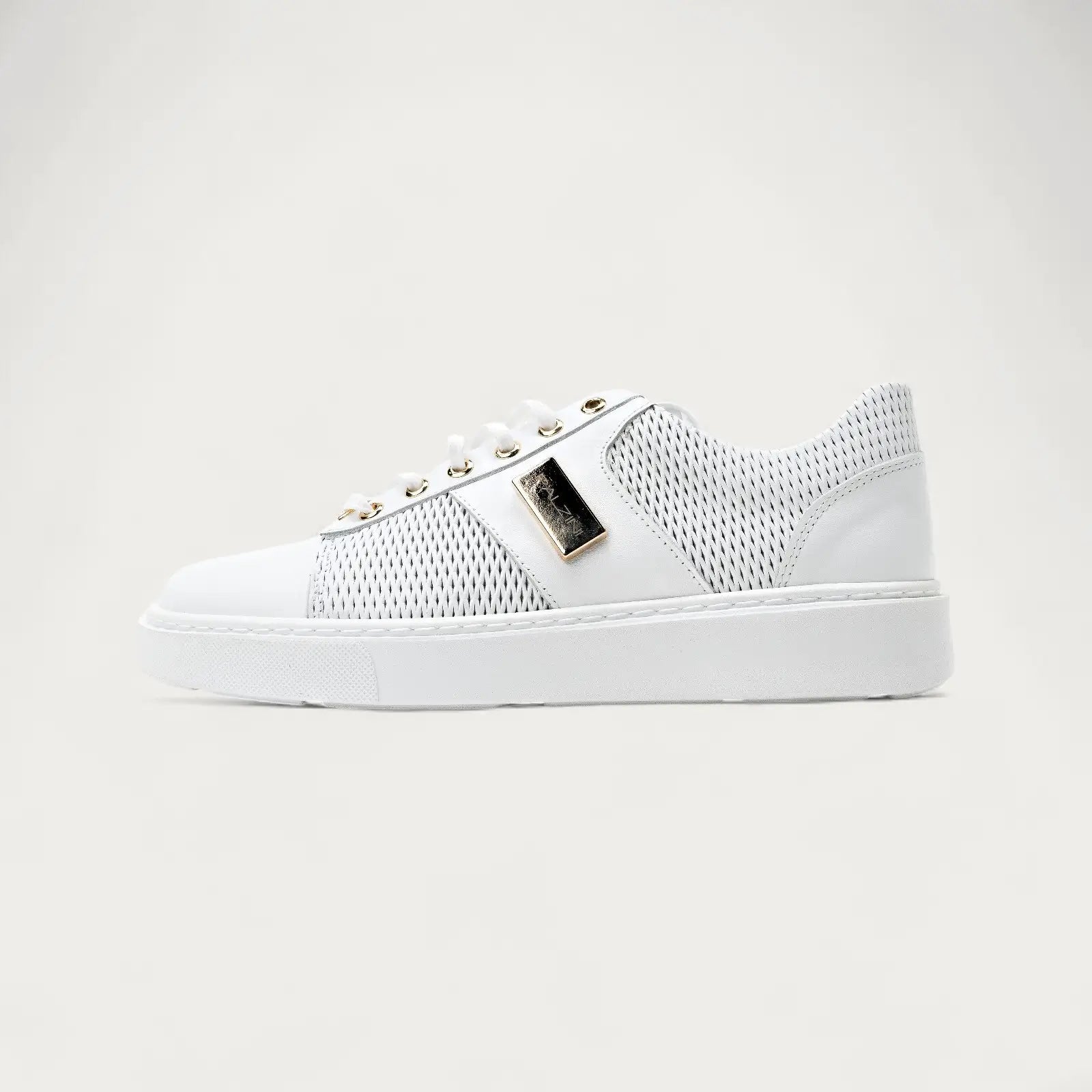 Featuring a premium white perforated upper with gold hardware accents, this shoe delivers both breathability and visual appeal. The sleek low-top profile ensures versatility, while the cushioned footbed and durable outsole make it ideal for day-long comfort — from casual outings to evening events.