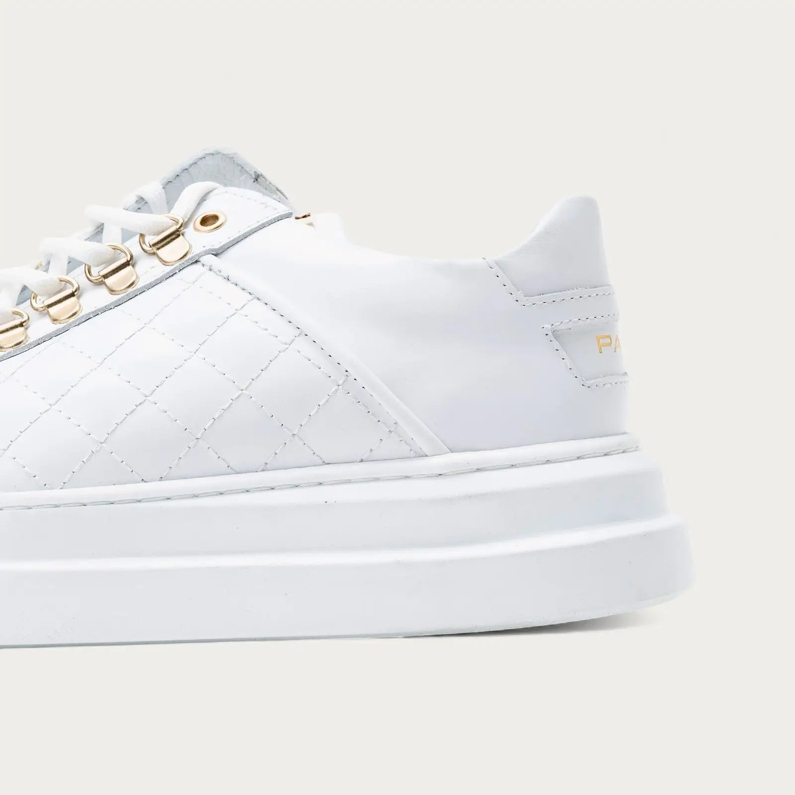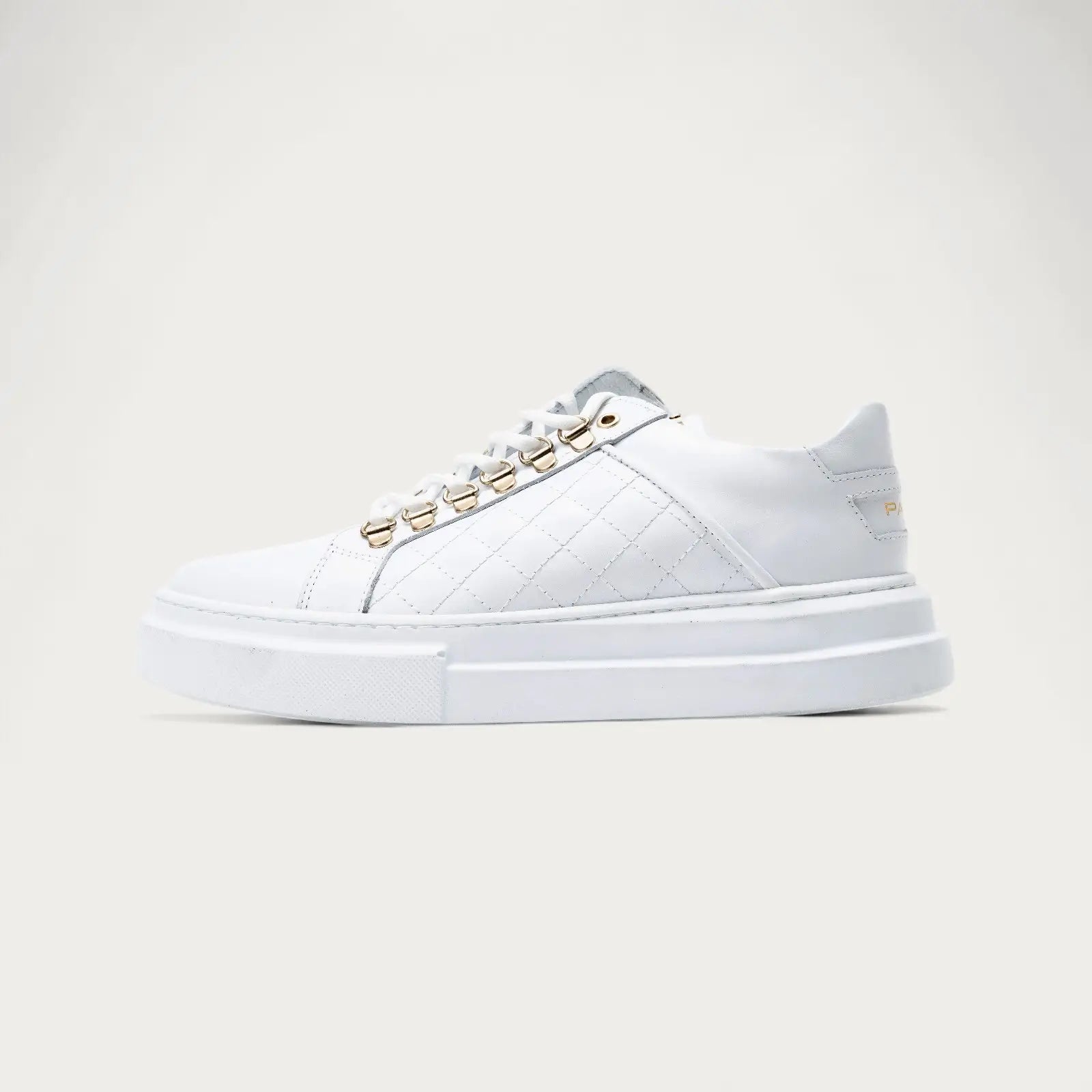 The clean white leather upper is elevated with diamond-stitched side panels, adding subtle texture and depth. Gold eyelets and accents offer a touch of sophistication, while the chunky platform sole ensures both comfort and a contemporary edge.