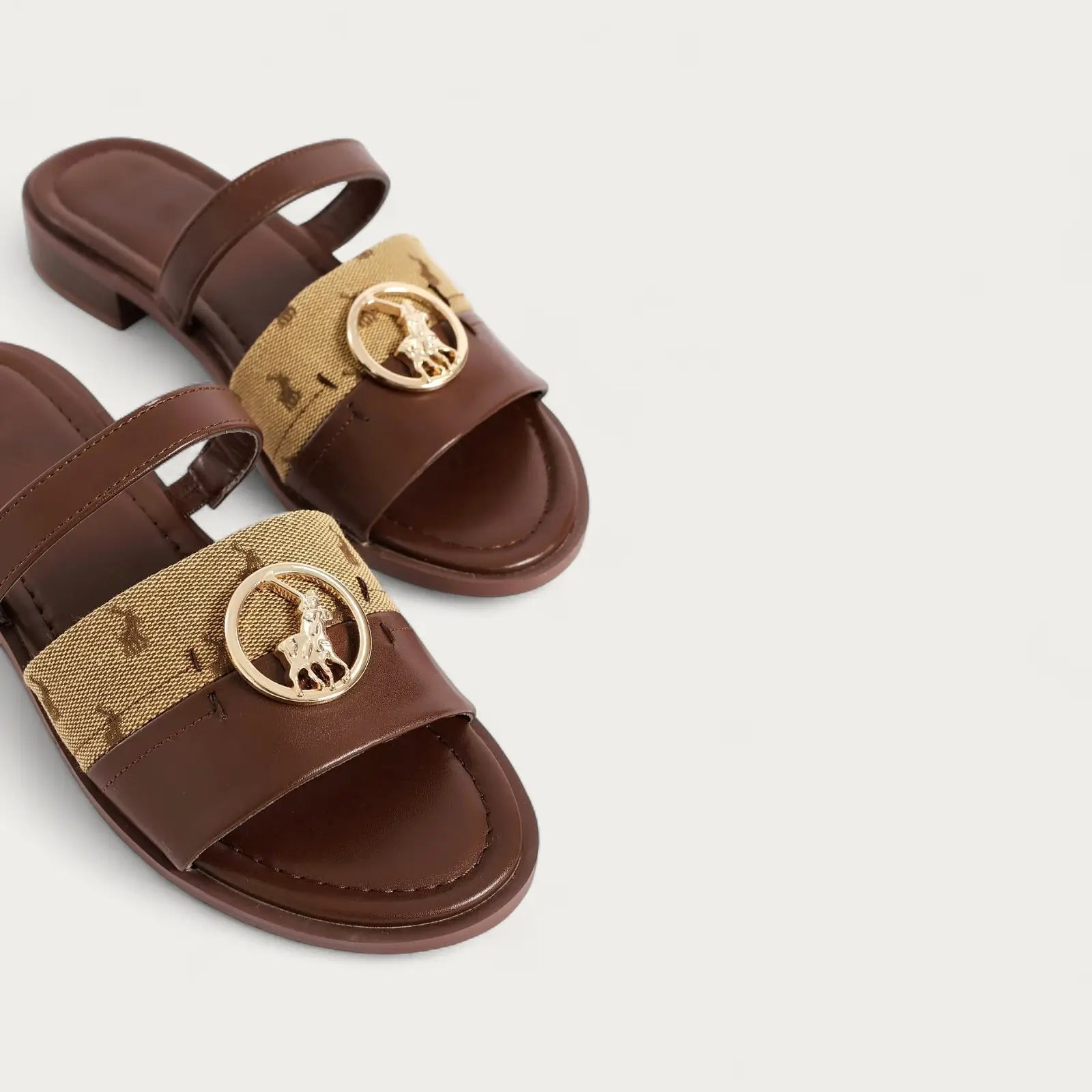 Polo Circle Trim Tan Sandal – A refined, warm-toned sandal that blends classic Polo elegance with everyday comfort. Designed with smooth tan straps, a subtle jacquard panel, and a signature circular metal trim, this style adds a polished touch to casual outfits. The low block heel ensures stability and ease, making it perfect for all-day wear. Ideal to pair with summer dresses, linen trousers, or smart-casual looks.